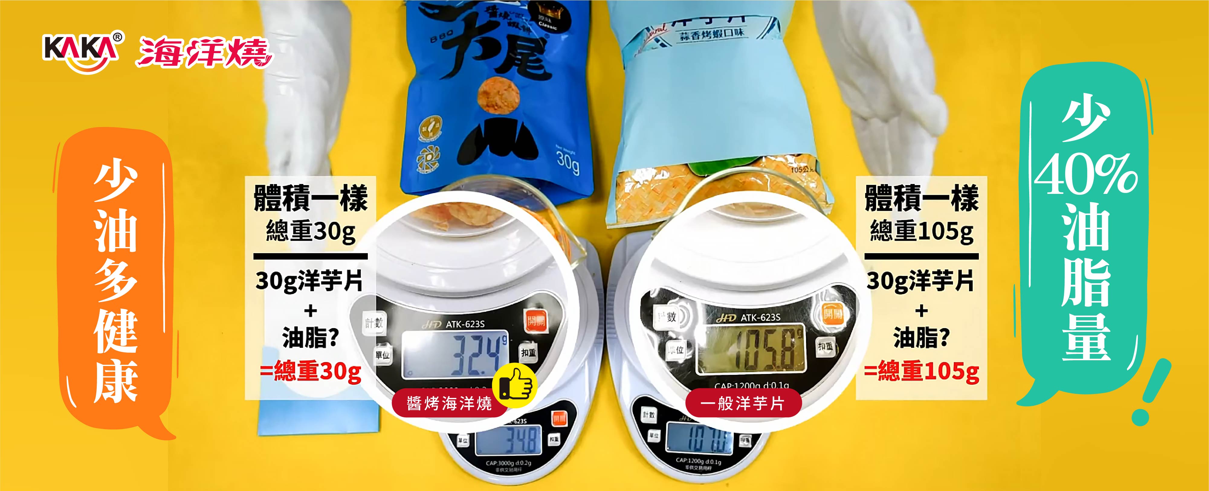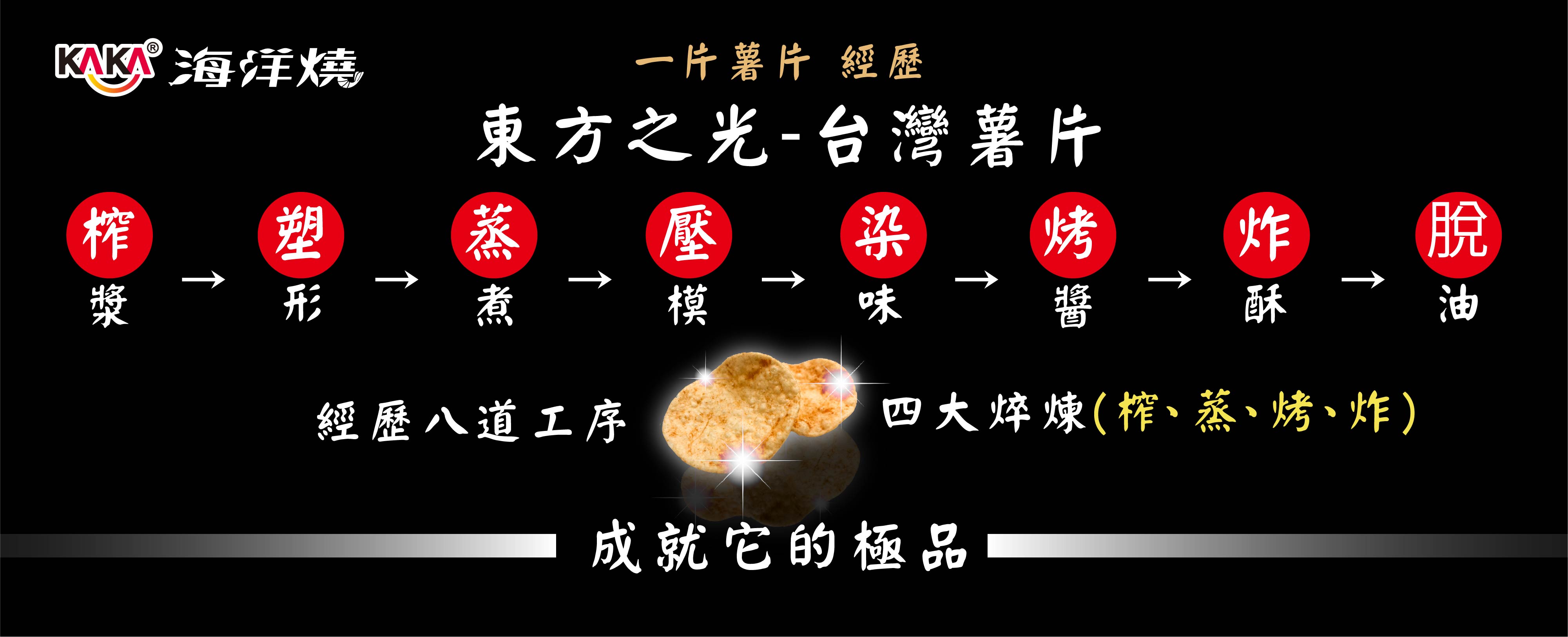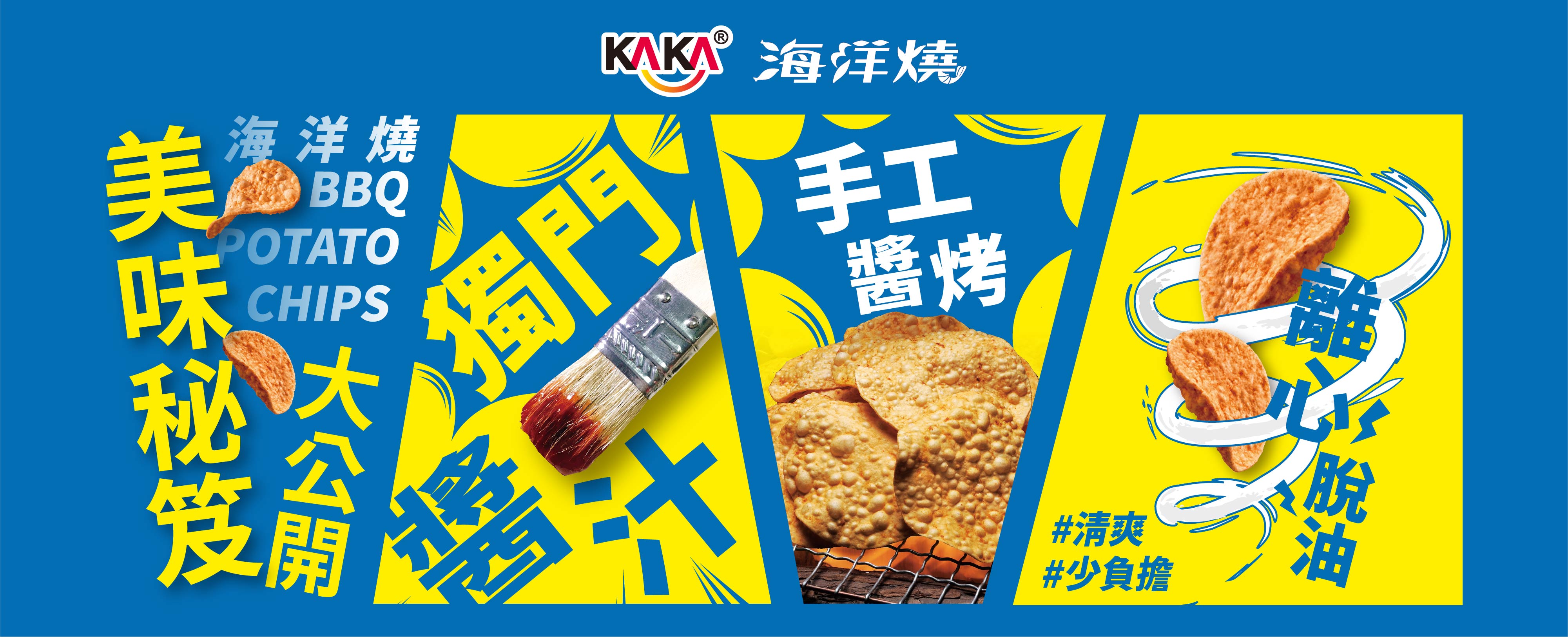 KAKA堅守著八大工序,專注成就卓越品質,秉持著中國人對吃的講究。獨家的醬烤技術,不僅凝聚了海鮮的鮮美,更賦予了味道濃郁的風味。通過離心脫油,我們成功使產品的油脂含量比一般洋芋片少了40%。